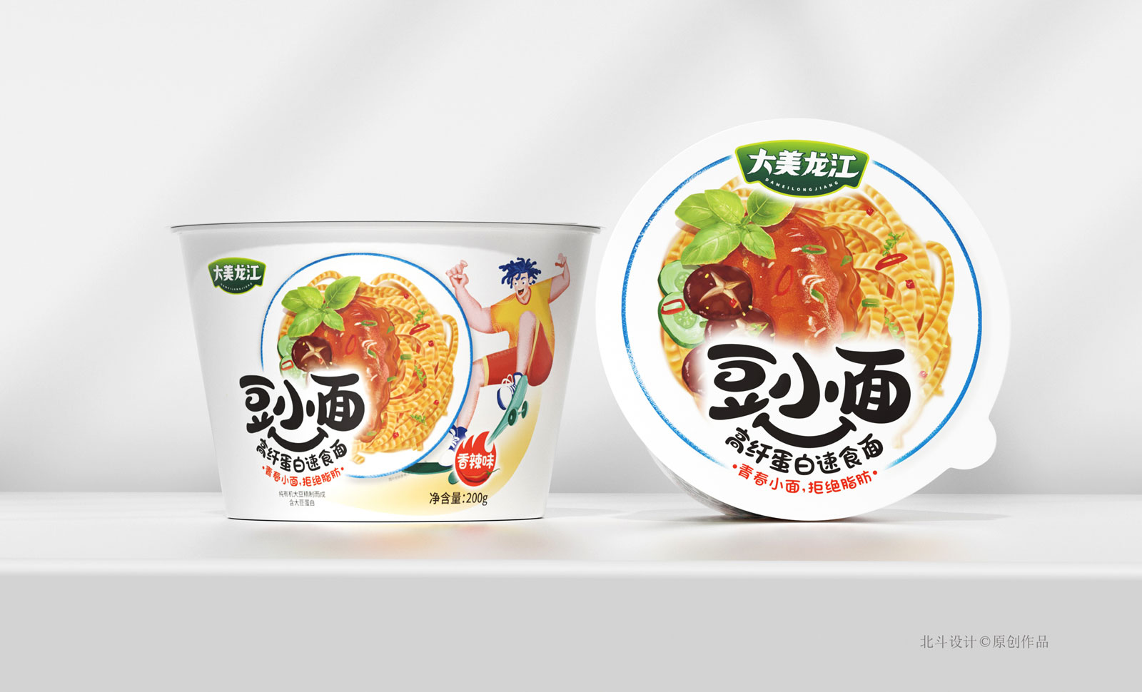 這是北斗設計與大美龍江合作的一個大豆速食面的包裝設計項目,北斗設計此次合作項目主要解決以下幾點問題:1.為大美龍江大豆面解決子品類的命名問題,2.為新的子品牌設計標志符號,3.重新定位并設計新的包裝形象。
