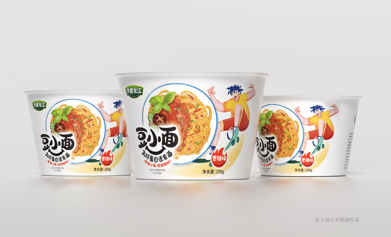 圍繞小面,年輕的關鍵詞,我們開始為其定制了一個卡通ip形象,搭配著滑板作為道具,非常酷炫。在解決完品牌的符號的創意后,接下來最終重要的就是產品的理解。對于食品包裝設計而言,北斗設計始終覺得,味覺+視覺上的食欲誘惑,比任何文字秒速都來的直觀,所見即所得,看的到的美味才是最具有活力,為此我們采用了手繪形式,還原真實大豆面的直觀感受。